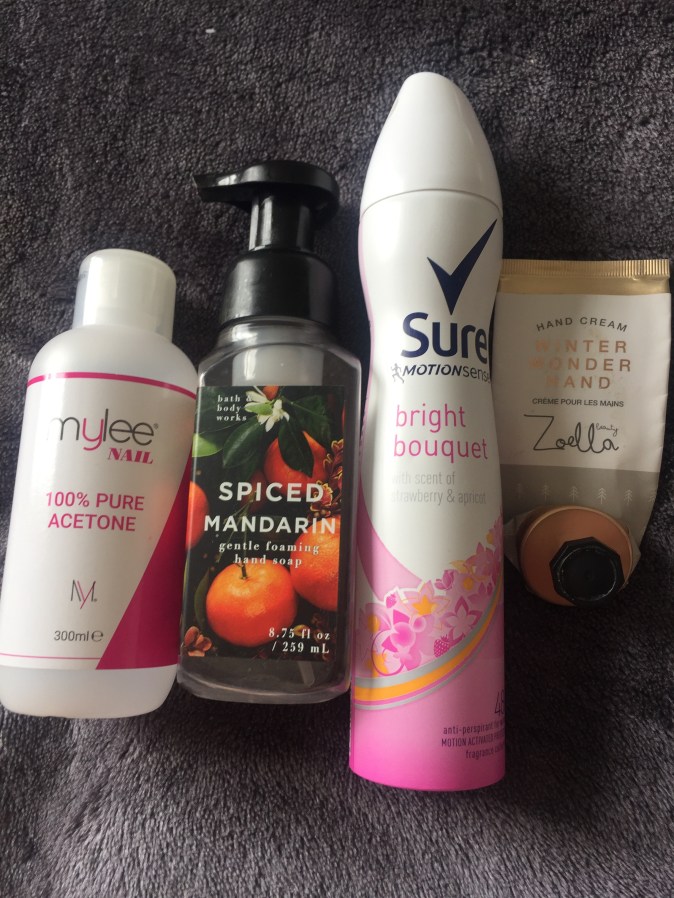 (L-R: Mylee Pure Acetone, Bath & Body Works Spiced Mandarin Foaming Hand Soap, Sure ‘Bright Bouquet’ Deodorant, Zoella ‘Winter Wonderland’ Hand Cream)