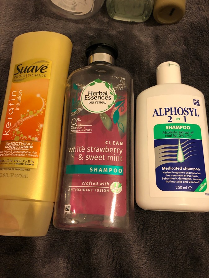 (L-R: Suave Keratin Infusion Conditioner, Herbal Essences Strawberry and Mint Shampoo, Alphosyl 2 in 1 Shampoo)